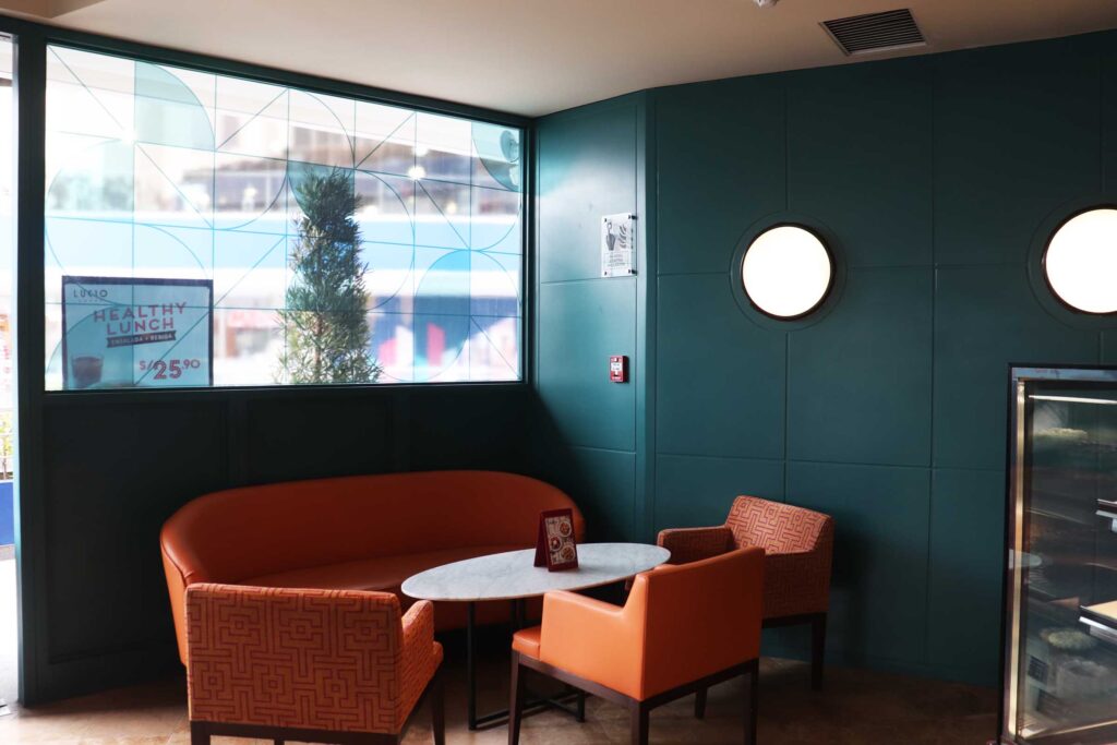 Revestimiento de pared interna y externa, bancas tapizadas.